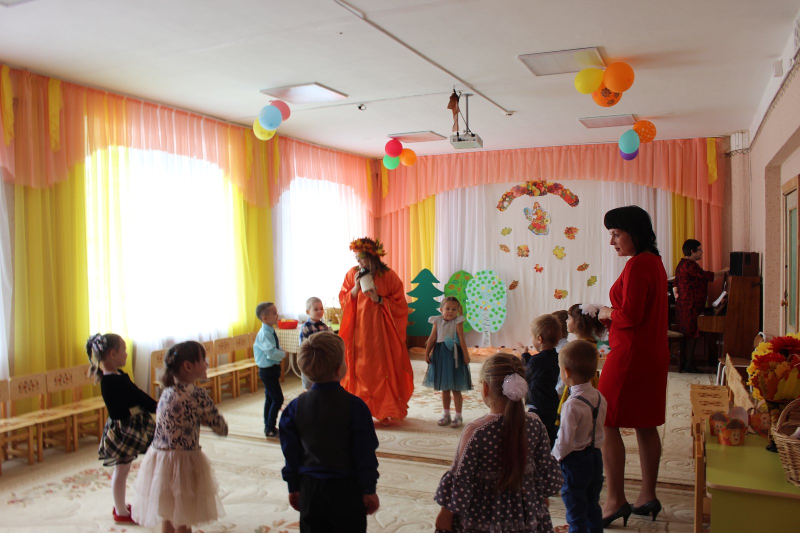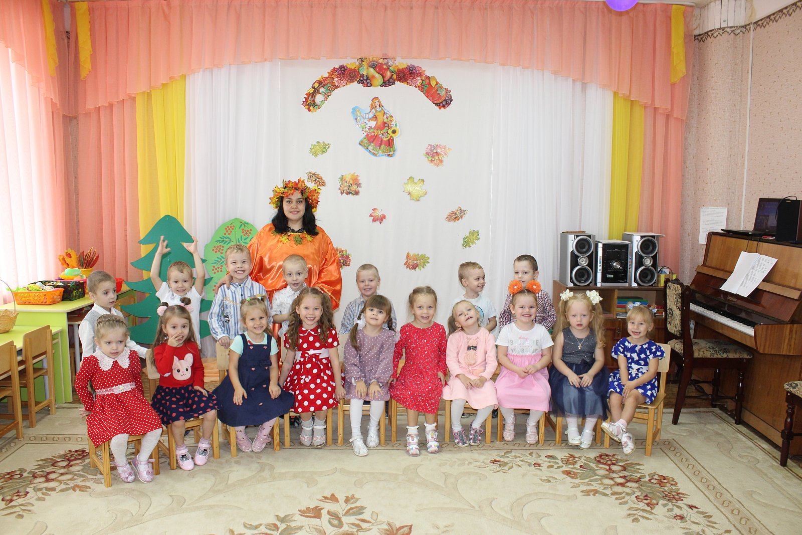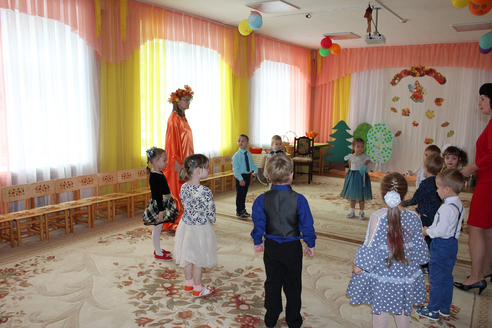 Цель мероприятия: систематизировать знания детей об осени. Приобщать детей к образам осенней поры, познание красоты окружающего мира, проявленной средствами музыкальной выразительности. Создать детям радостное праздничное настроение.