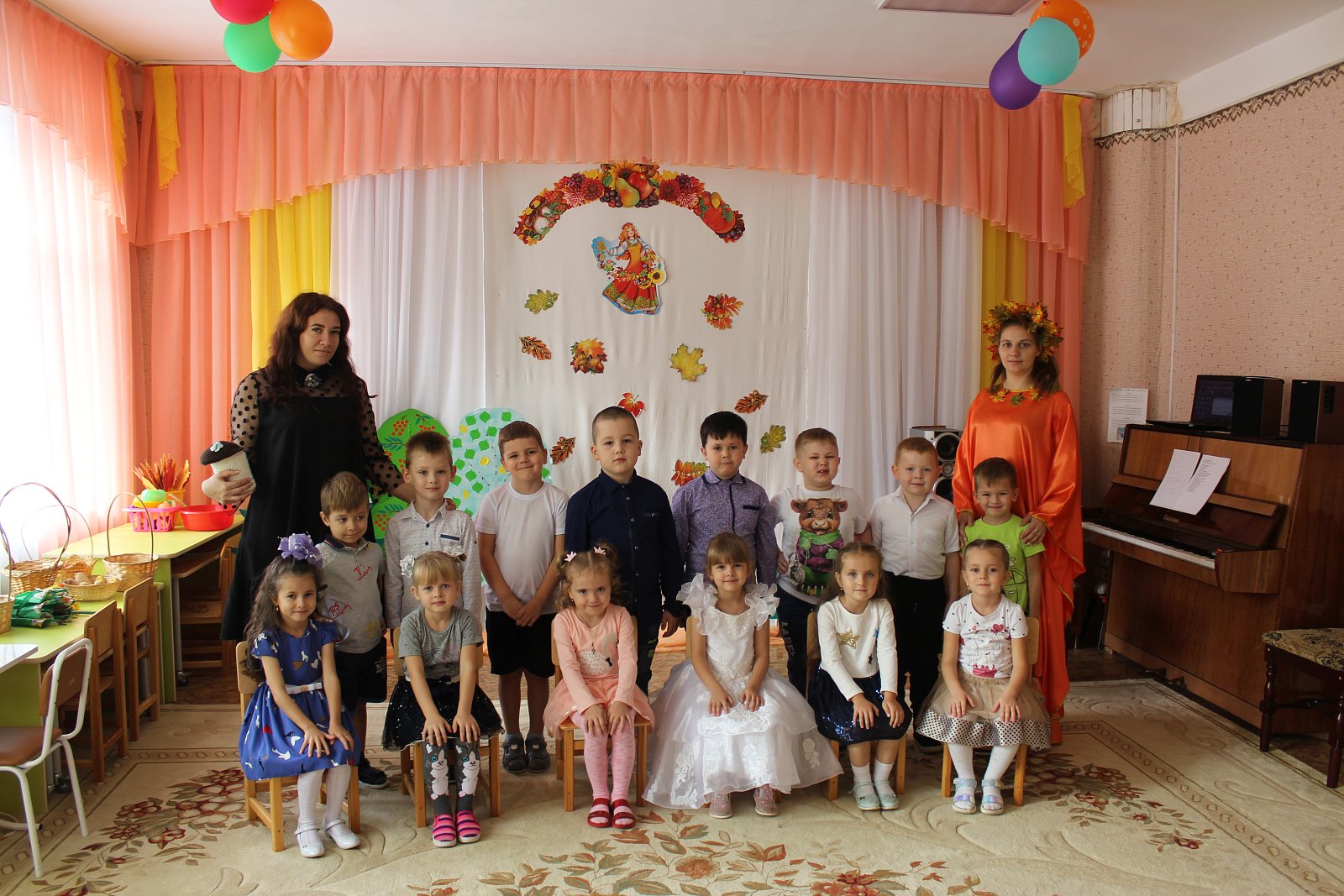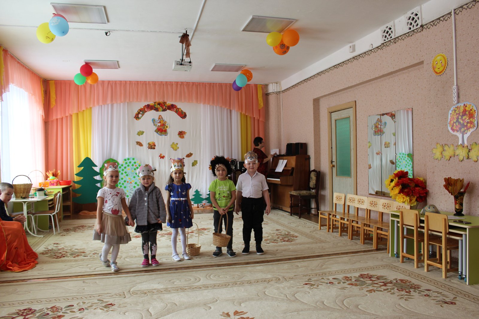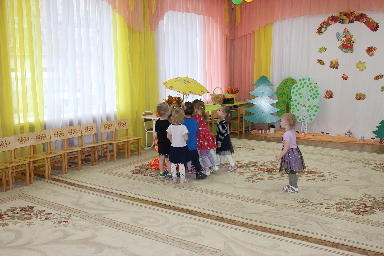 Цель мероприятия: систематизировать знания детей об осени. Приобщать детей к образам осенней поры, познание красоты окружающего мира, проявленной средствами музыкальной выразительности. Создать детям радостное праздничное настроение.